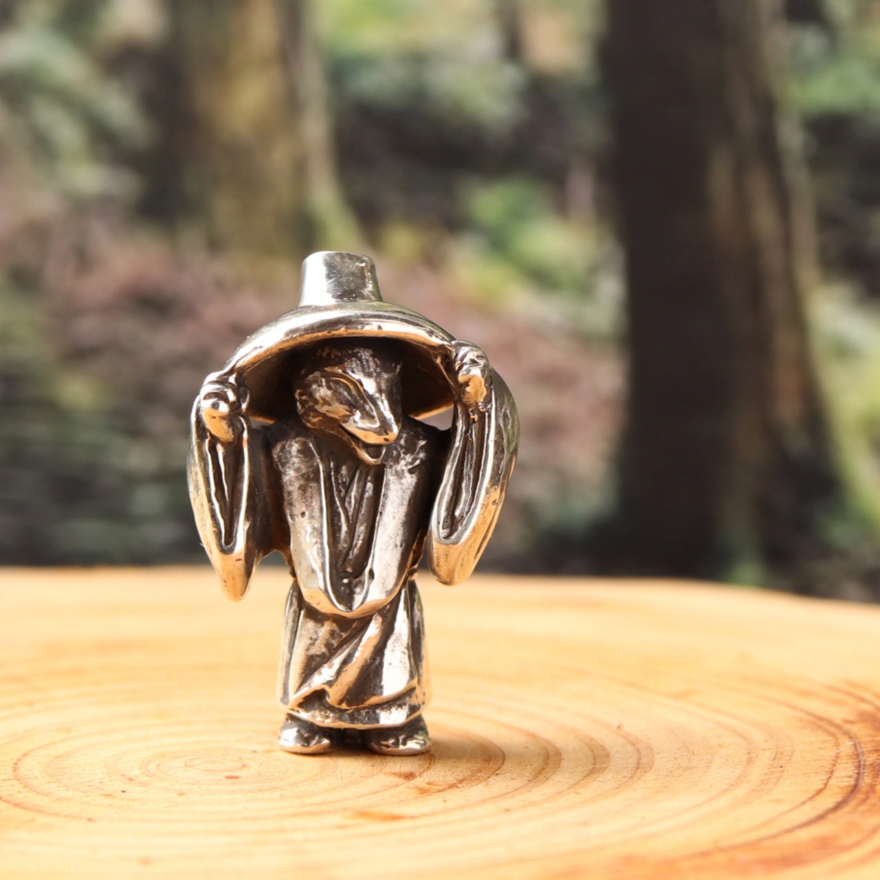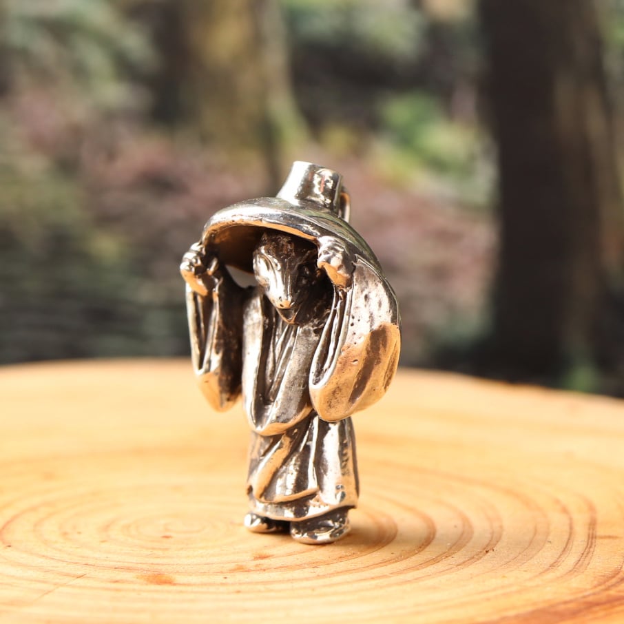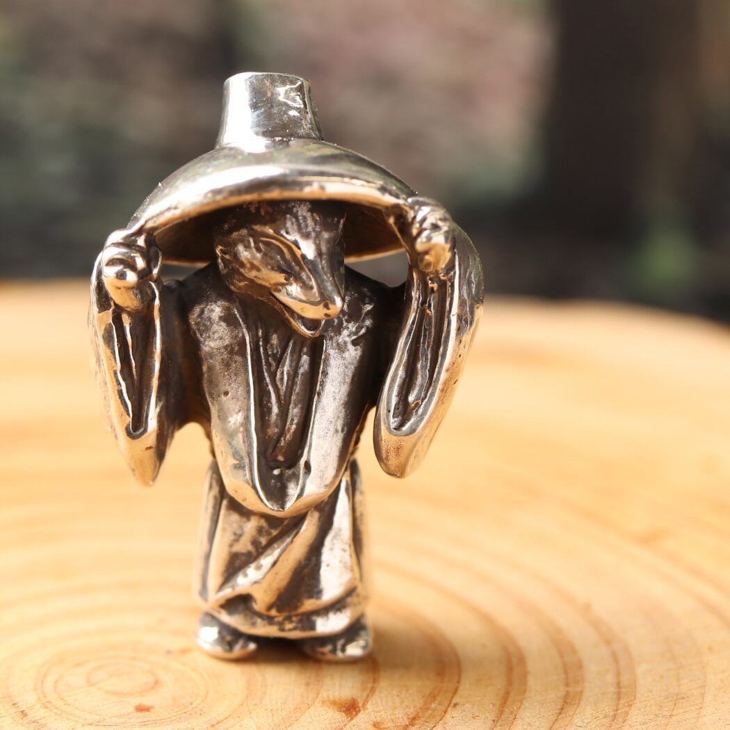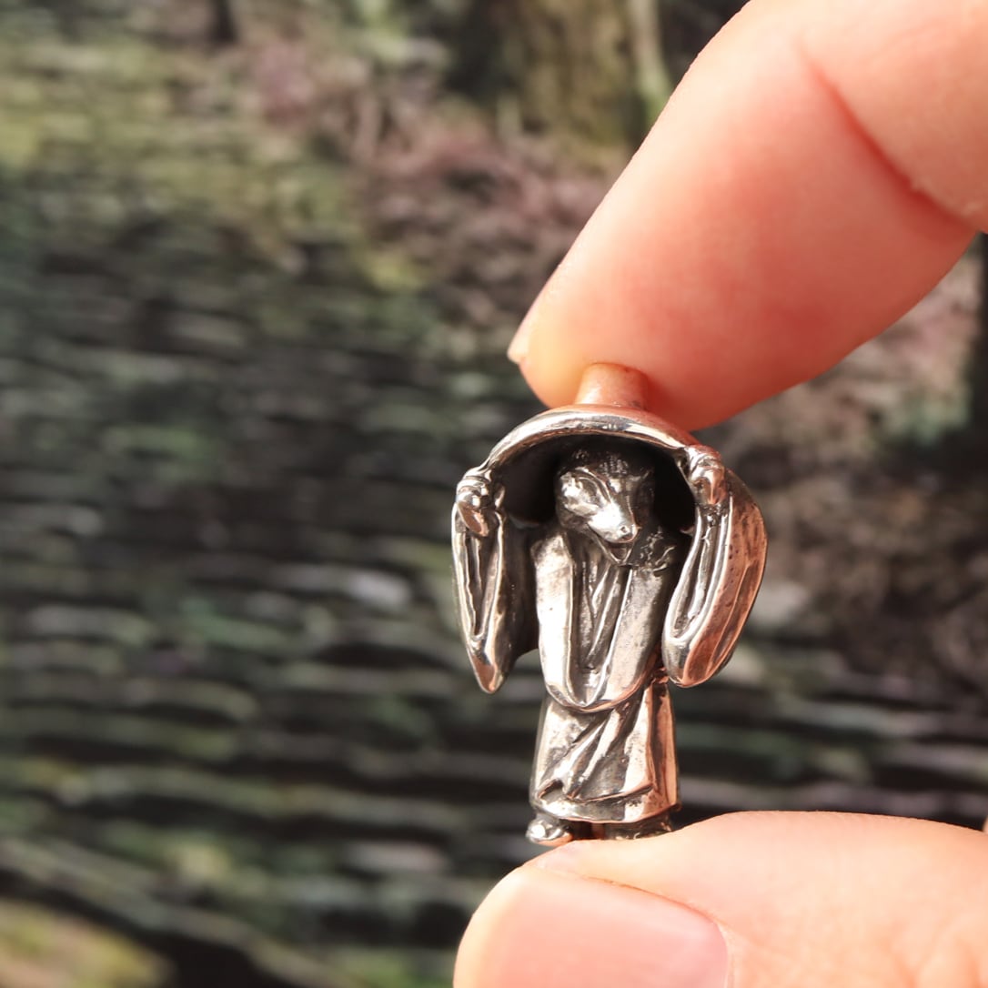 頭に被った笠からひょっこりと顔をのぞかせる姿は、まさに絵巻物そのままです。何かをひそかに見守っているかのように見え、また、まるでこれからどこかへ向かう旅人のようです。他の動物たちとは一味違う、物語を感じさせる独特の存在感を表現しました。