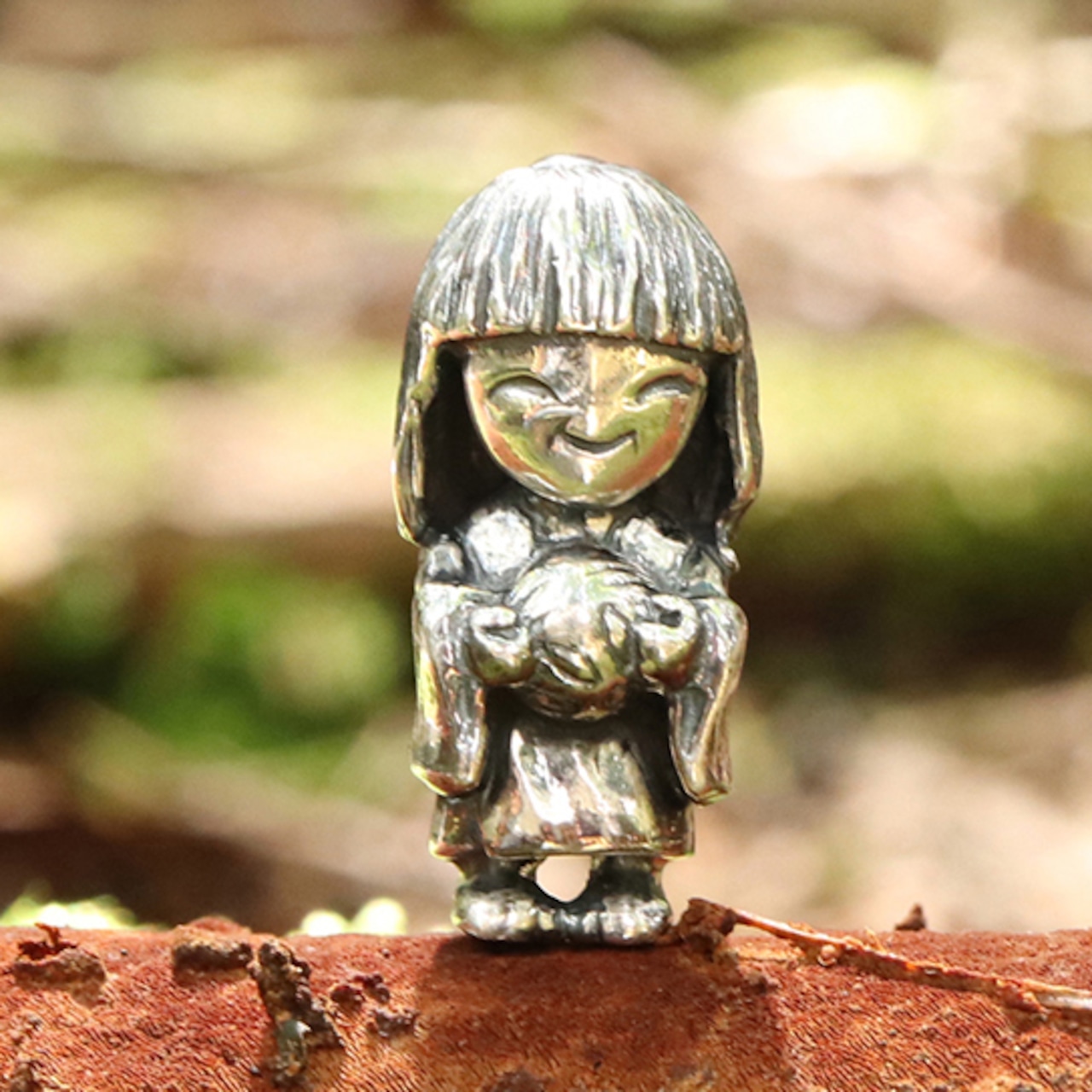 この座敷童子はボブヘアの女の子。いたずらっぽい微笑みを浮かべ、着物姿で鞠を持つ姿が愛らしいです。